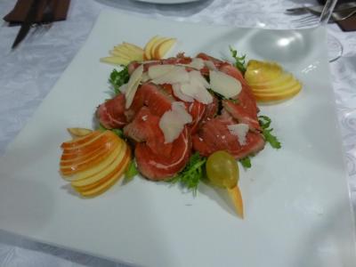 お勧めのステーキ、マスのグリル、牛肉のカルパッチョをいただきました。