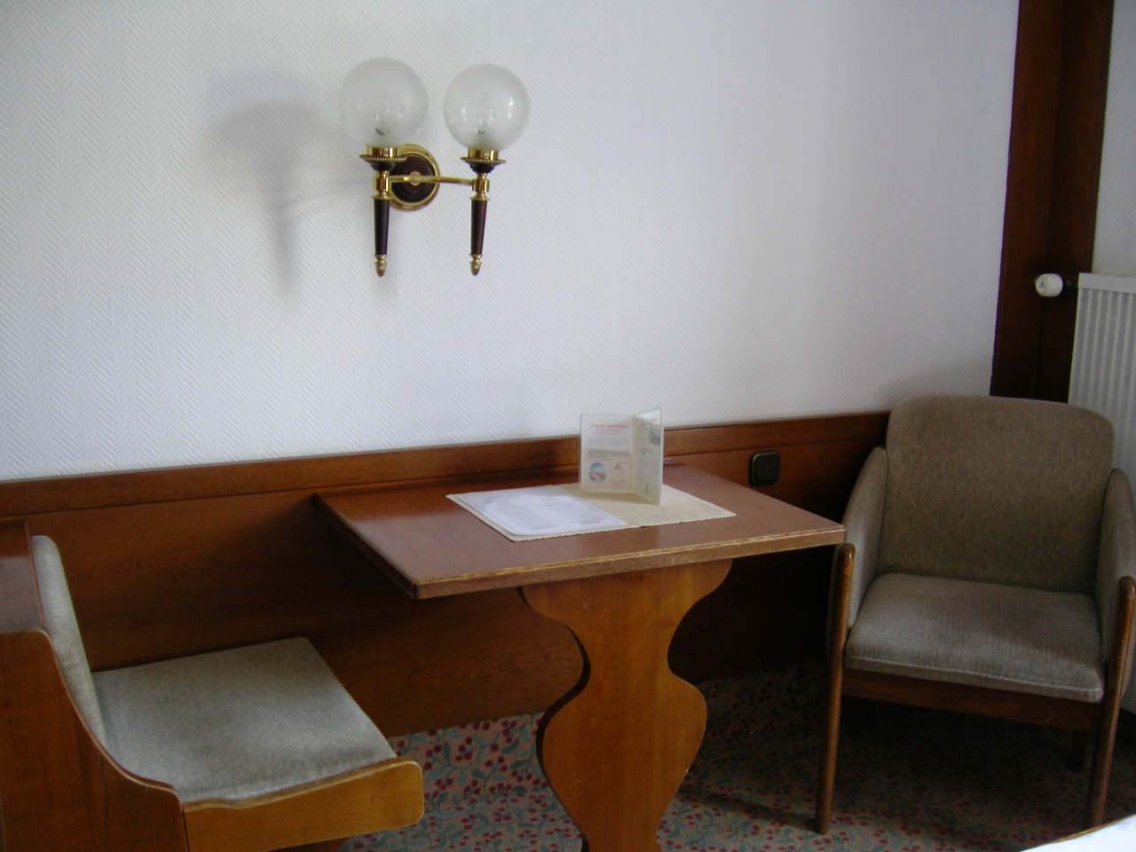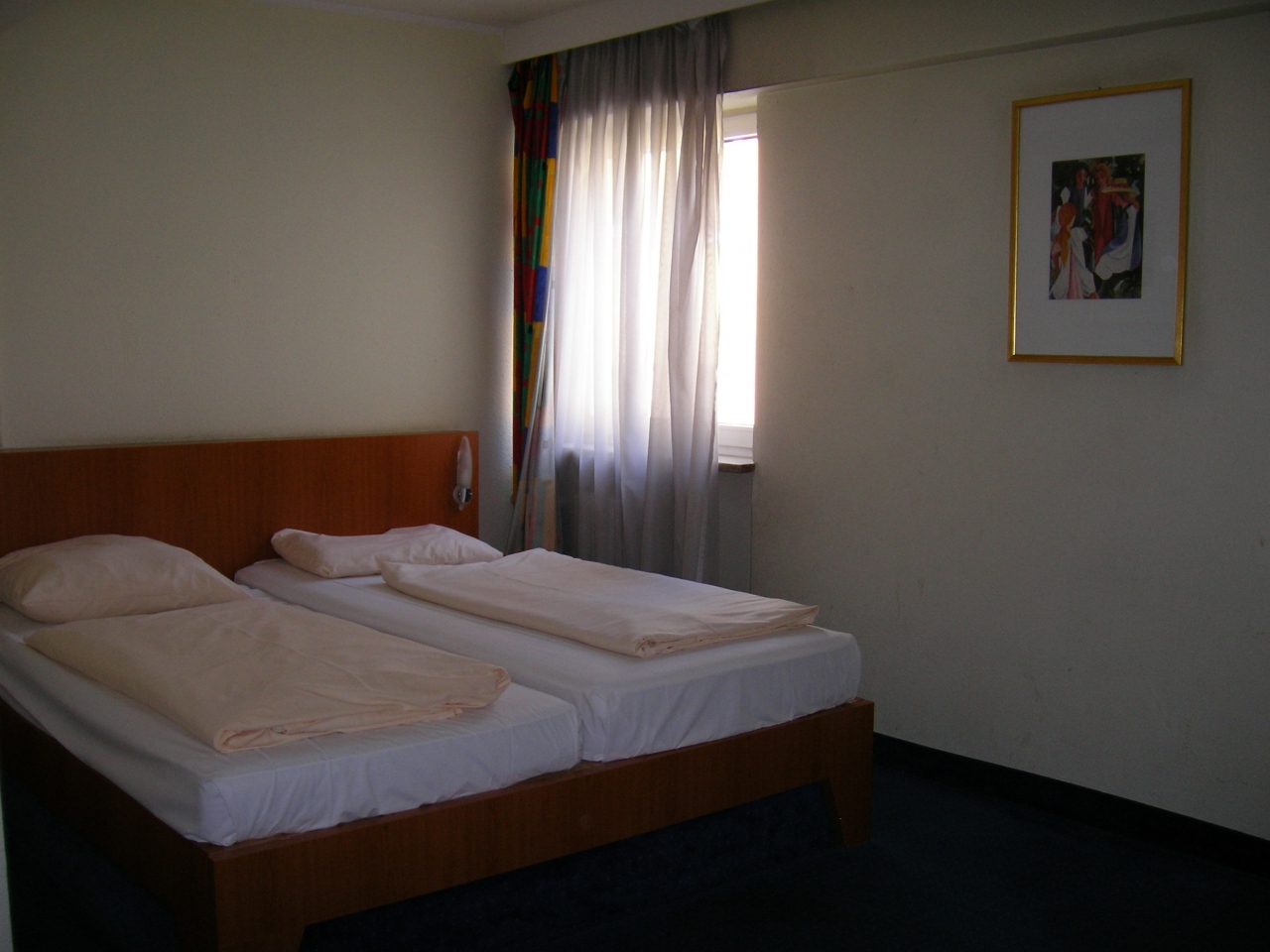 部屋自体は広くて、ウォーキングクローゼットもあり、丸テーブルにイスもちゃんと2つ、冷蔵庫あり、グラスや栓抜きもありで、設備的には問題ないのですが、エアコンがないので部屋は夏場かなり暑い。しかも、広場に面した部屋だったので(2階だったが)、夜遅くまで人通りがあり、目の前はレストラン(酒場?)なので、うるさくて窓も開けれない。扇風機くらいほしい・・・。それから、部屋の照明が裸電球。防災法大丈夫なの?ってカンジ。