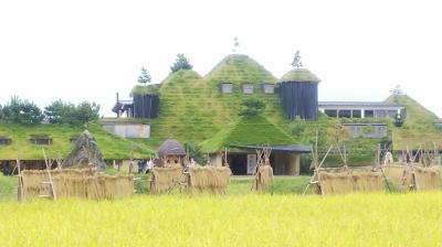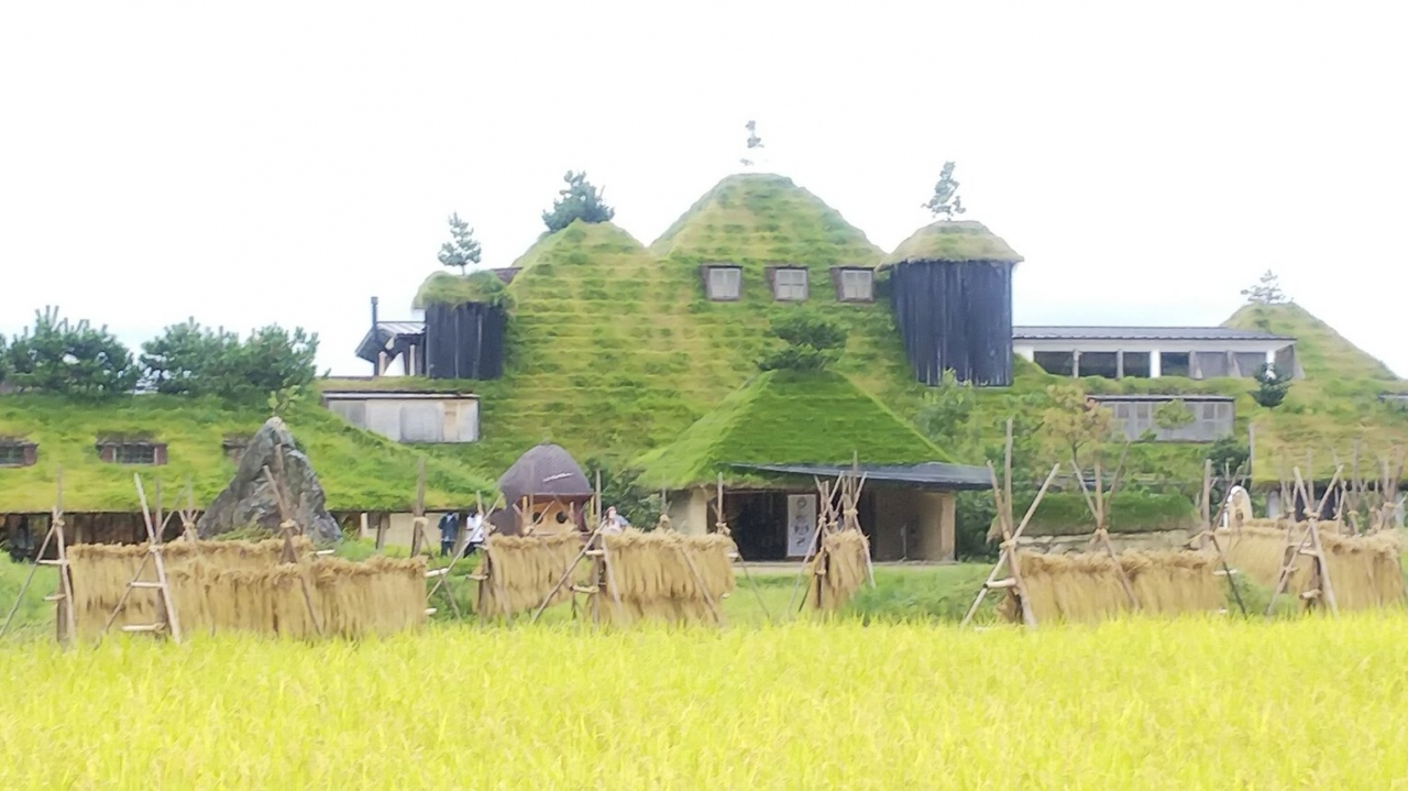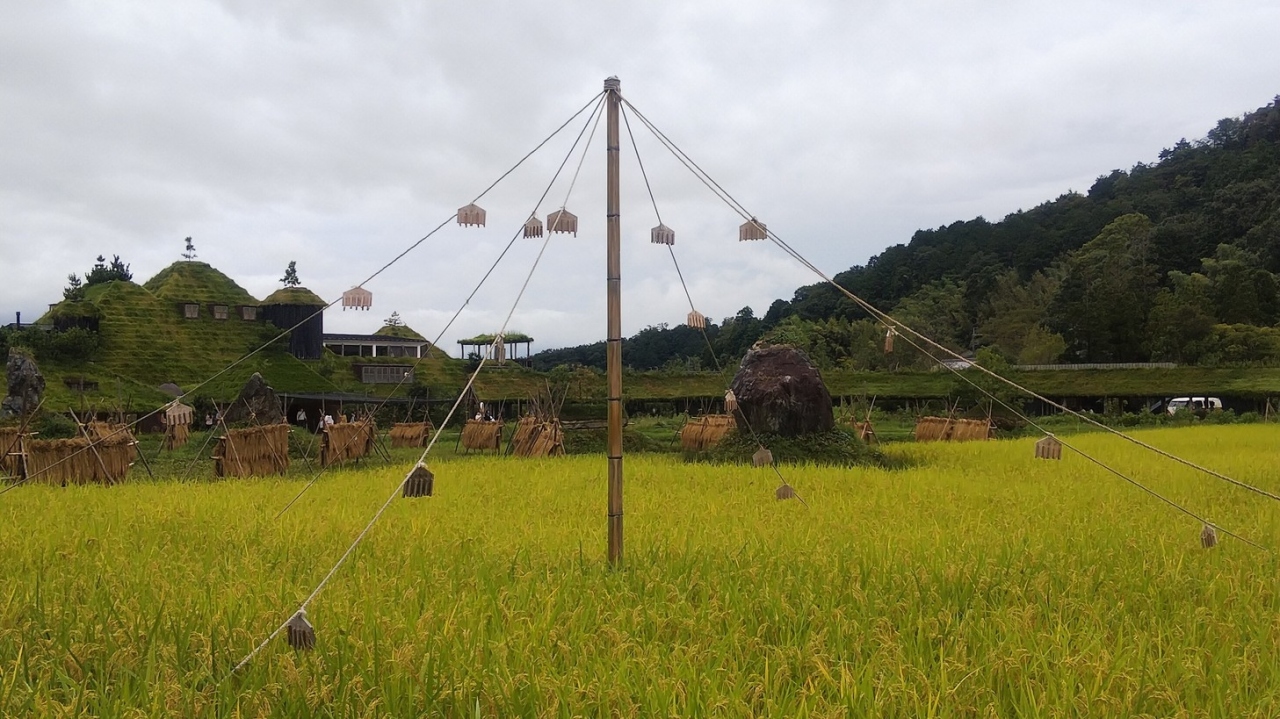 メインホールを通り抜けると円形の回廊の中は田んぼで、ちょうど稲穂が揺れていました。昔ながらの雀除けの鳴子!がデモンストレーションでしょうかつけられていて、ロープを引くと鳴るようになっているのが楽しかったです。- 旅行時期