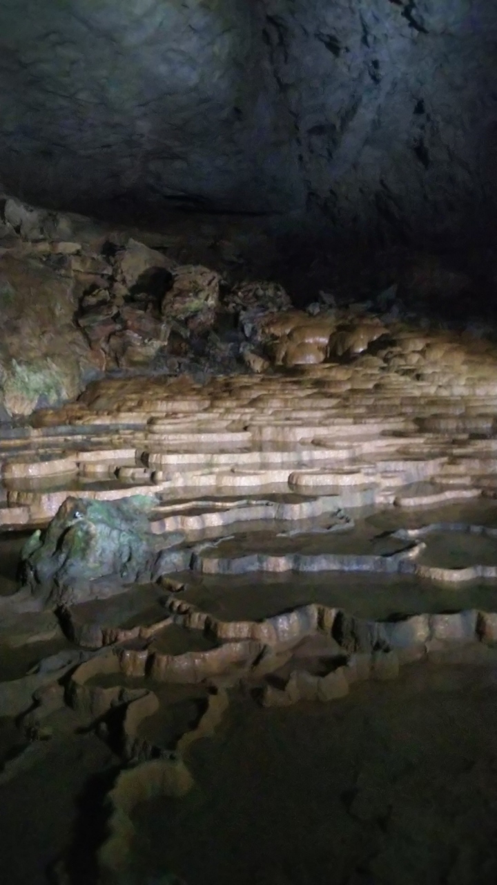 入口を入った瞬間からいきなり歩道の幅の何十倍もある空間が広がります。天井も高く100メートル先まで見通せる広さです。鍾乳洞にありがちな、頭をぶつけないように身をかがめて歩く、といった注意は必要ありません。要所要所でアナウンスボタンを押すと必要な説明が流れてポイントも理解しやすいです。照明もシンプルで以前よくあったような不自然なライトも控えられています、
