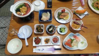 困ったのは夕食。平日の岳温泉では居酒屋以外に夕食を提供している店がありません。自炊用のキッチンはありますがあまり本格的な料理はできないのです。特に水曜日は近所の居酒屋も定休日となるため、1日だけ宿の2500円の夕食を頼みました。朝食は連泊にかかわらず毎日ほぼ同じメニューが続きました。