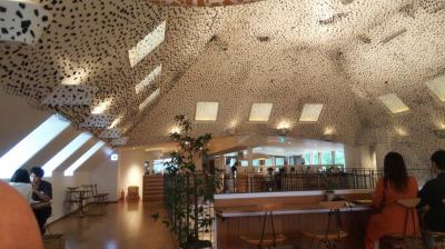 建物の外観は屋根の上に草の生えた北欧の田舎家みたいなイメージですが、カフェの内装も白い壁と木の床、天井には炭を砕いたような小石大の物が埋め込まれ、宇宙船を思い起こすような楕円形の細長いテーブルが島のようです。独特の世界観が面白いです。