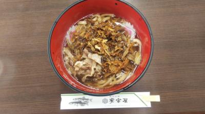 ゴボウの素揚げがかけうどんの上に乗っています。最近よくあるゴボウの天麩羅ではなくささがきゴボウの素揚げです。食感はカツオ節を少し厚めに削ったものに似ています。うどんのなかにもゴボウの粉末が練りこんであるのか、色が褐色がかって香ばしいゴボウの香りがするのと、麺になかなか歯ごたえがあっておいしくいただきました。