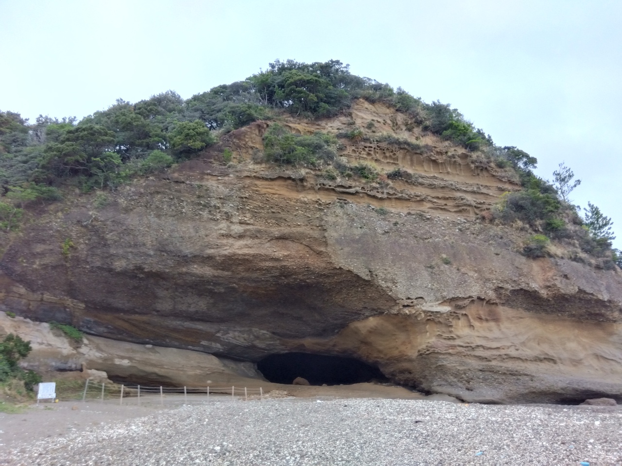 千座の岩屋の数倍の高さの岩の断崖の下にぽっかりと暗い洞窟が開いています。洞窟の中は落石の危険があるため立入禁止です。周辺は人影もまばらで太平洋から押し寄せる波の音だけが響いて、自然への畏怖が涌いてくるような浜辺でした。