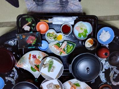 今回泊まった和洋室はワンルームの十分な広さの部屋で、ベッドが2台とダイニングテーブルの置かれたカーペットのスペースと、ビーズソファが置かれた畳のスペースがあり、夕食は部屋のテーブルまで運んでくれました。食べきれない量の食事で残った釜飯はおにぎりにしてくれました。食後は畳の上のビーズソファにもたれてだらだらとくつろぎました。