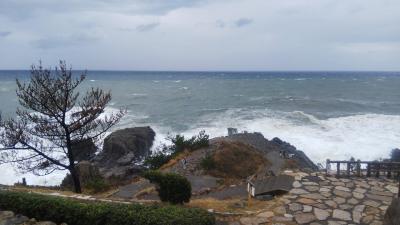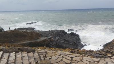 意外だったのは、ドラマ中で犯人は断崖の上に追い詰められていくのですが、その断崖までにかなりの距離があったこと。土産物屋さん、飲食店街の方が高い位置にあり、そこから坂道を下った場所が東尋坊の入口です。石の柵が設けられ、断崖にはそこからさらに下ります。最も高い場所で高さ25メートルの崖ですが、正直、上から下ってきたのでそれほど高さを感じませんでした。前述の通り吹き飛ばされそうな雨風のため岩場に降りるのも諦めたので、遠く柵の内側からのみの観光となりました。実際に岩場に立っていれば迫力あったと思います。ただ波の激しさは十分感じました