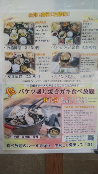 「しおさい」に入ると入口にメニューの写真が。蒸し牡蠣、酢牡蠣、牡蠣フライ、鍋、牡蠣飯をはじめとしたいろんな調理法を一度に楽しめる御膳もあれば、焼き牡蠣食べ放題もあり、焼き牡蠣を楽しむ客は炭火のあるエリアに、御膳のみの客は座敷やテーブル席に通されます。御膳に焼き牡蠣つけるのも可能です。
