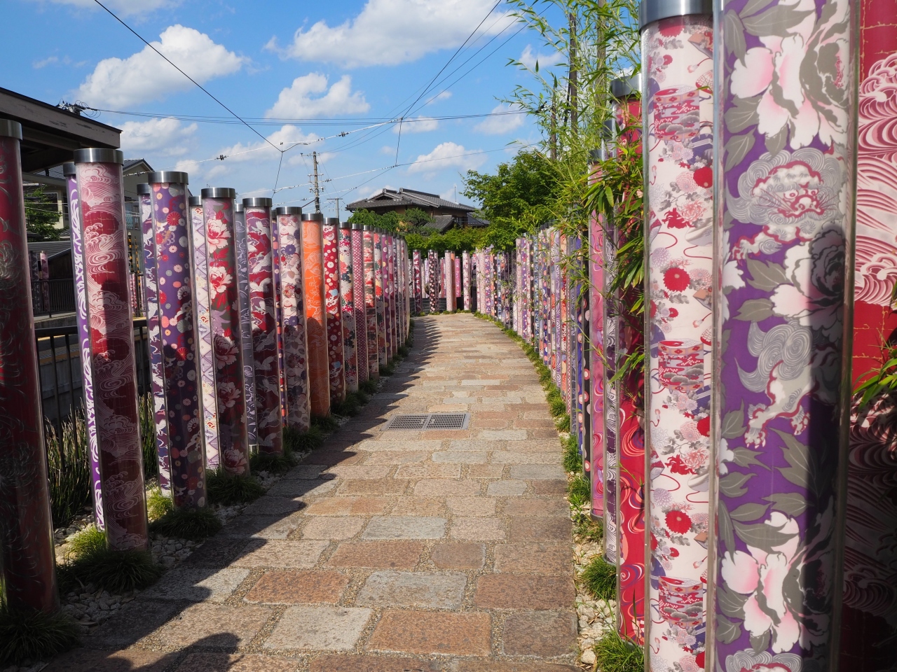 回りにはキモノフォレストといって京友禅をアクリルで包み、高さ約2mのポールにしたもを林のように見立てている場所があります。