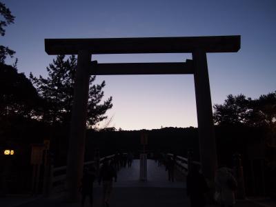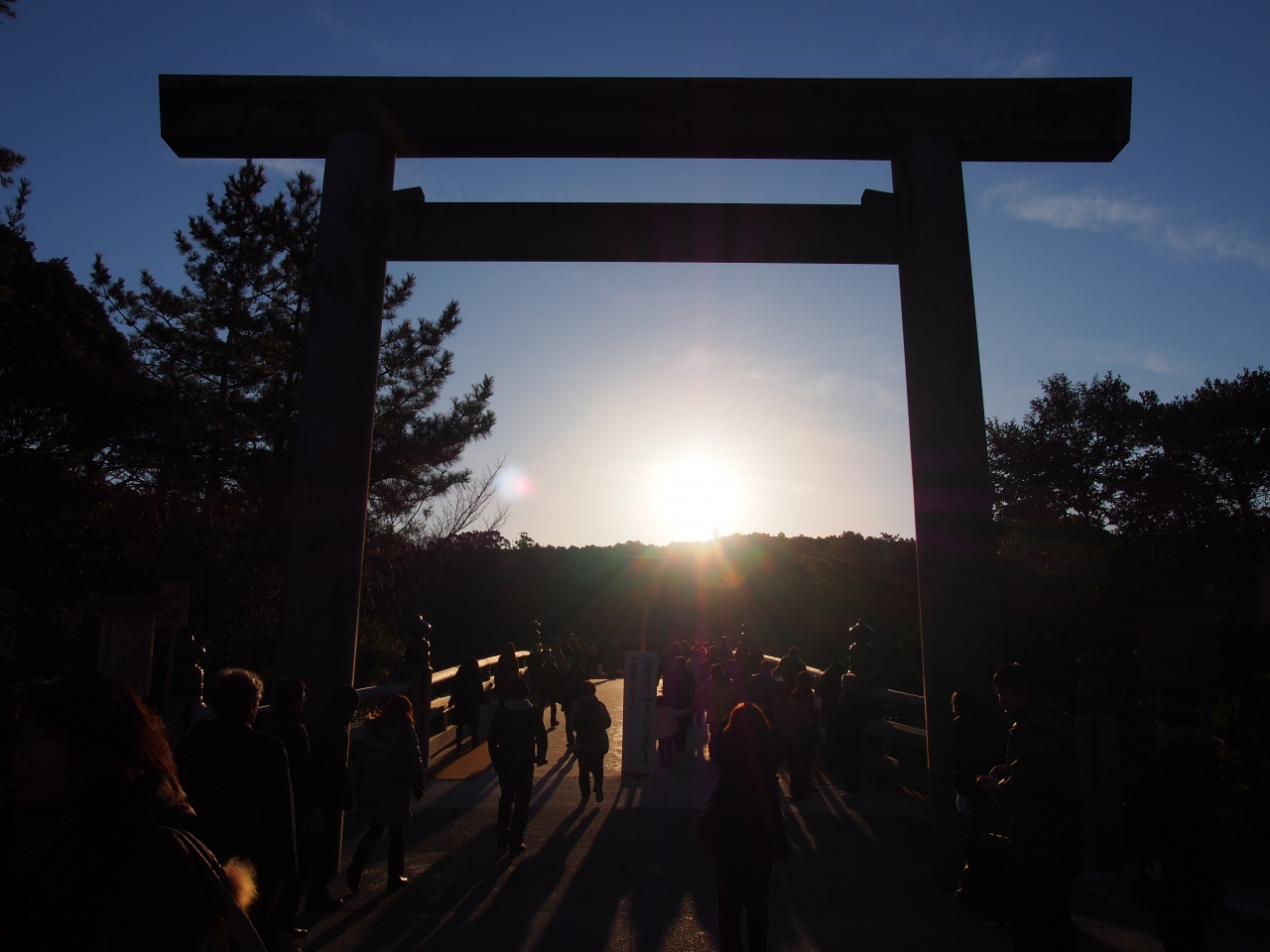 早朝日の出まで言わなくても太陽が昇っていくときが綺麗です。宇治橋の後ろの太陽が現れてまるで後光が差しているみたいです。とても神秘的な雰囲気です。また、ここは右側通行なのでみなさん行儀よく歩いてます。早朝だと橋のうえから月も見れました。