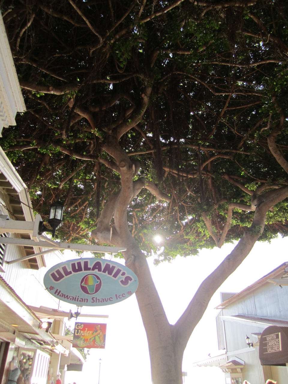 マウイに一冊しかないタウン誌にクーポンがあります。小豆、持ち、アイスからトッピングが選べます。私はアイスにしましたが種類も自由でココナッツをチョイスしました。かき氷のシロップも自由ですがレインボーにすると迷う事はありません。ツリーの下で小休止、なんとのんびりした時間でしょうか。