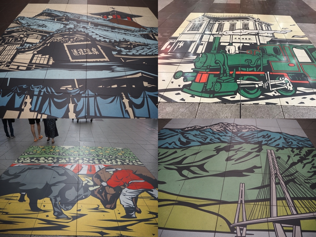 おそらく愛媛で一番大きな商店街です。入り口には三越もあり日曜日の朝には朝市が開催されて住民の方も野菜など購入されていました。薬局も何店かあり選べます。飲食店、衣料店もあります。道路には愛媛県の観光地の絵がありました。