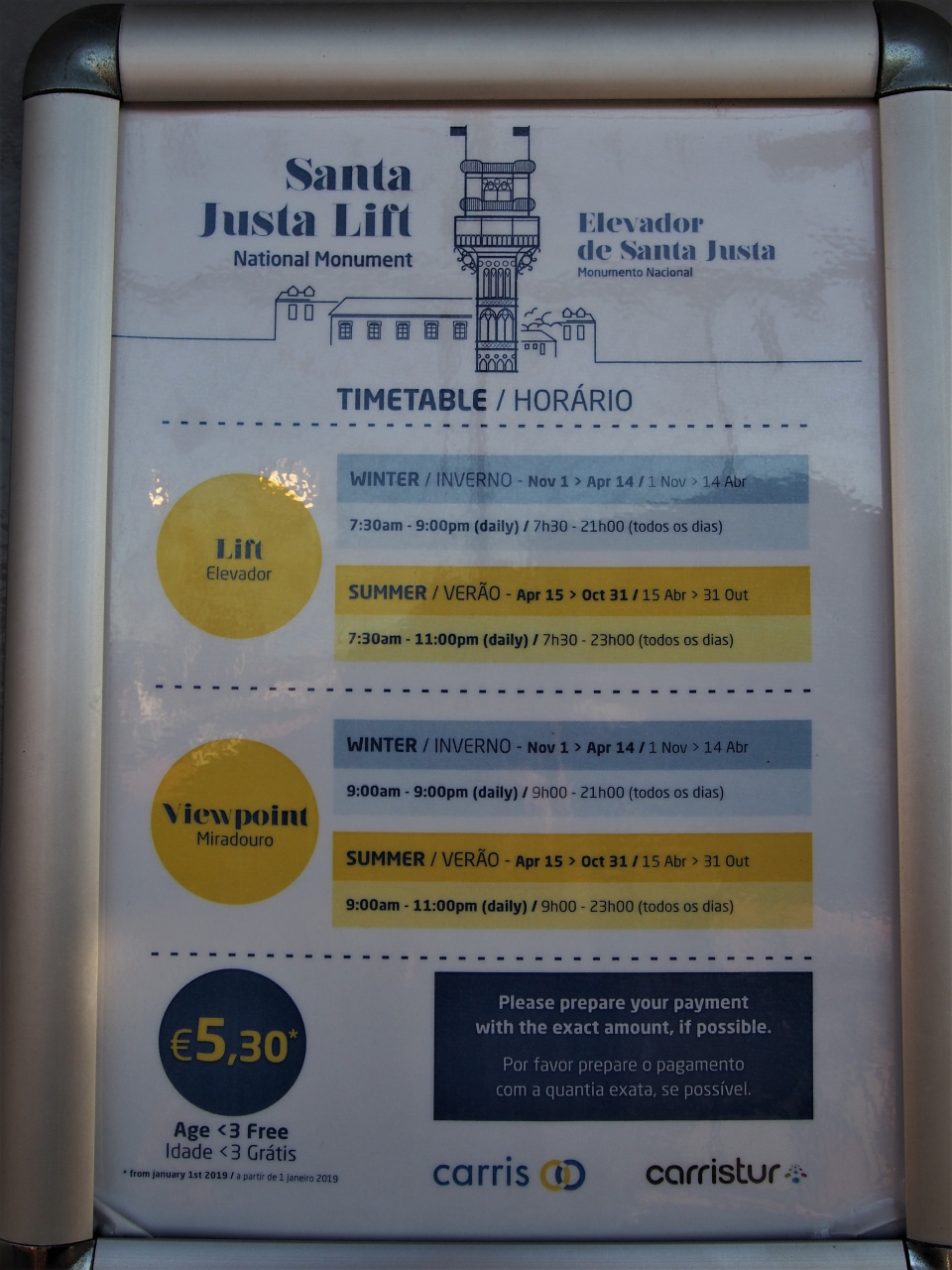 日中は混在するので朝一番7:30に行きました。動いているか不安でしたが10分おきくらいに動いていました。私はリスボアカードを持っているので無料ですが普通に払うと高い!距離はとても短いです。帰りは歩いてと思いましたが早朝はクローズされているので必ずエレベータを利用する必要があります。また、展望台には早朝は上がれないので注意が必要です。