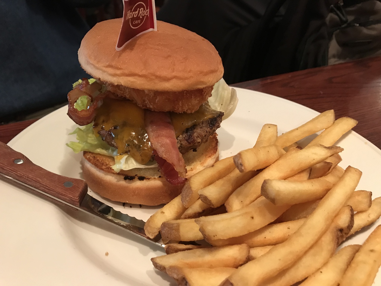 世界のハードロックカフェなのでハンバーガーが2000円程、ドリンクとサービス料で1人3000円の価格になります。しかし、ハンバーガーのボリュームもありポテトもしっかり肉の味があります。店内もハードロックカフェの雰囲気があるので、海外で食べる感覚です。