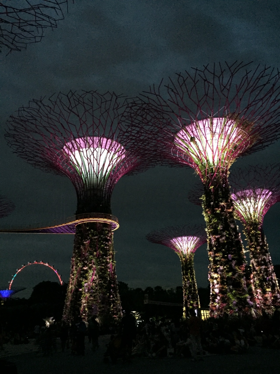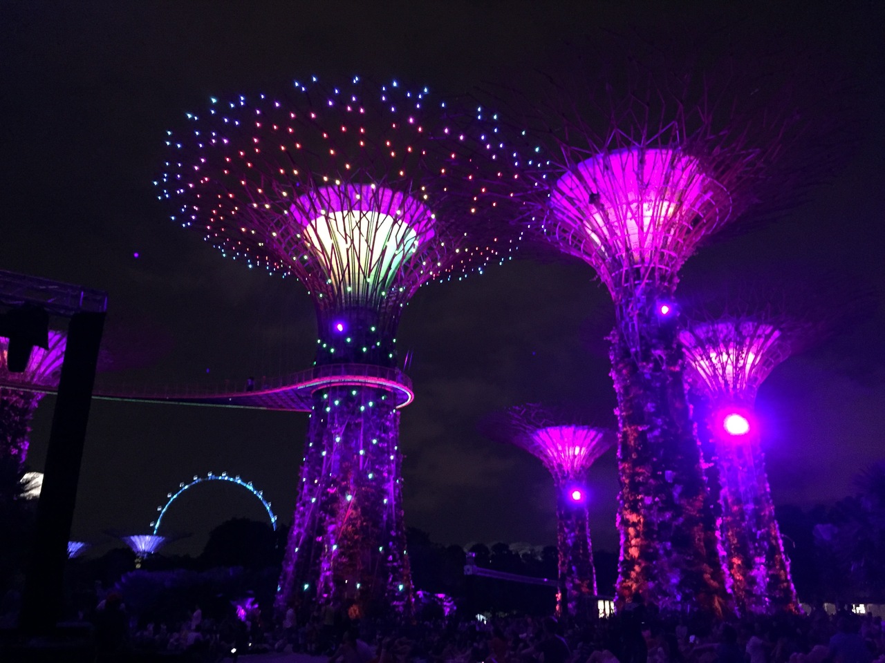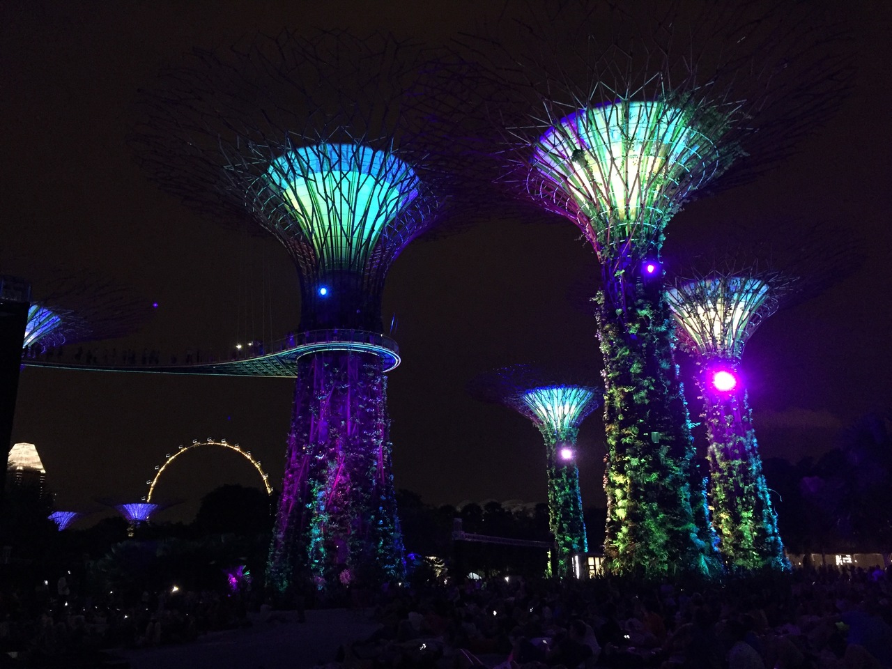夕方から観光につかれて休憩しながらショーが始まるのを待ちましたが、どこから見ても同じように素敵なショーを見ることができます。無料のショーですが音楽に合わせて人工的な木々が色を変えて日本にはないショーでした。おすすめです。