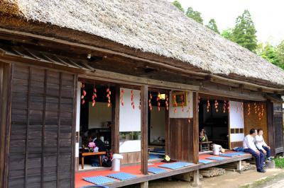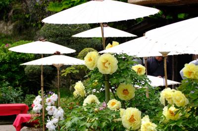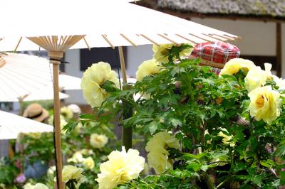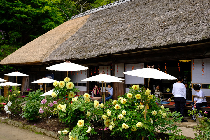 園内に茅葺きの古民家があり、いいアクセントになっています。この古民家では軽食が食べられます。お茶はセルフのようで、縁側に座って牡丹を眺めながらお茶を飲むことができます。