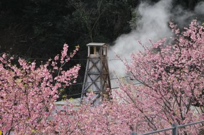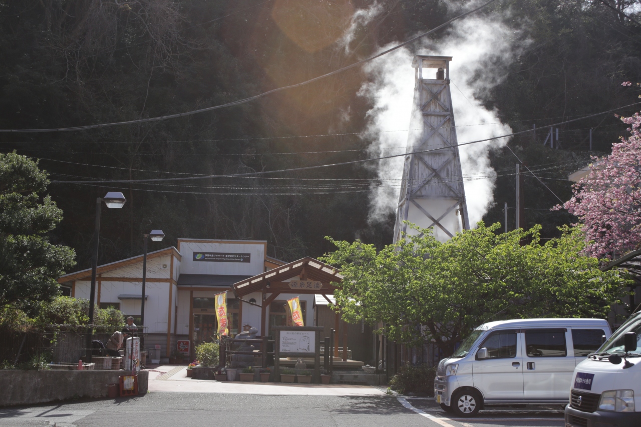 伊豆熱川駅のホームに降りると目の前に櫓があり湯けむりもくもくで温泉風情たっぷりです。