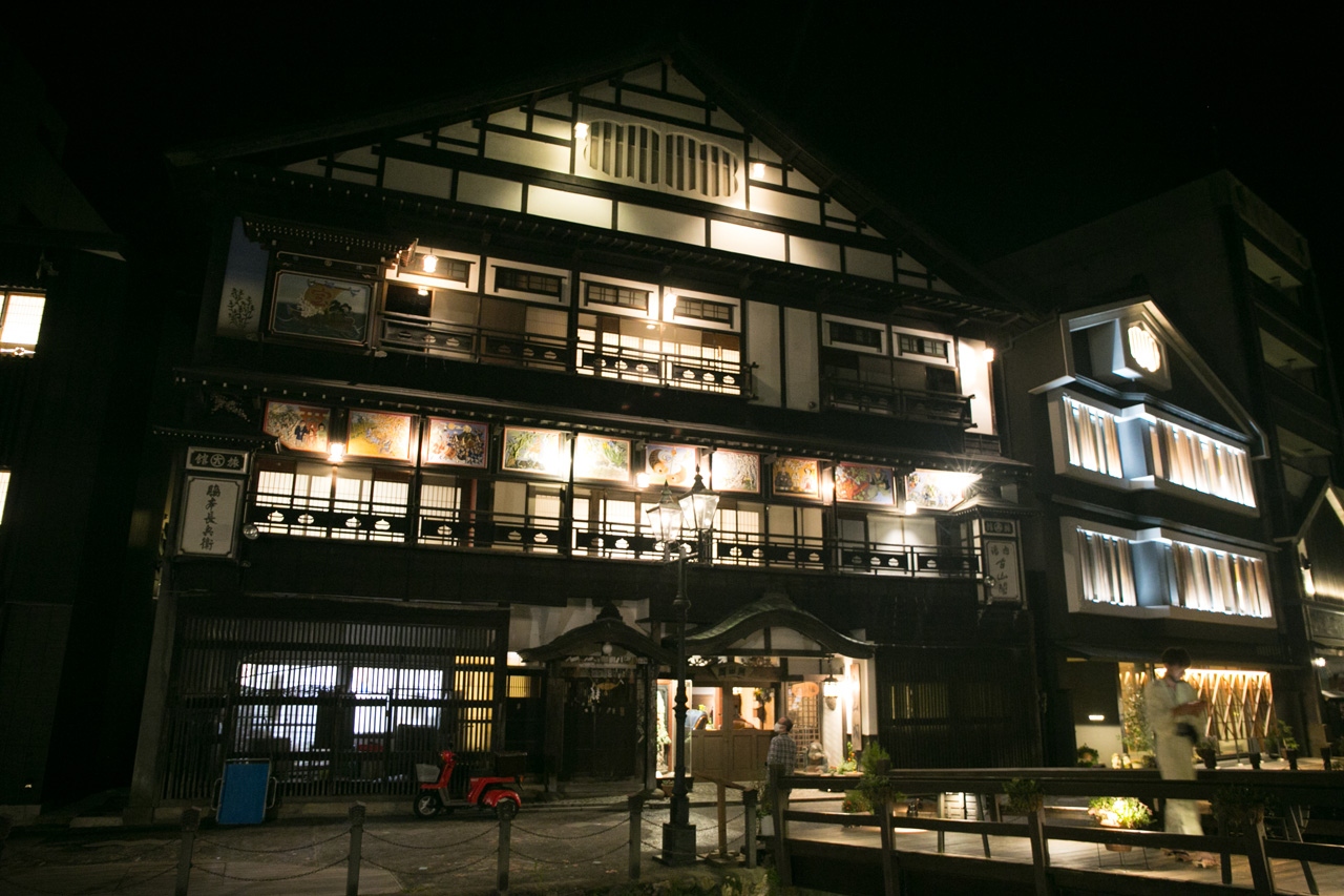 そのなかで古山閣は温泉街の旅館の中でも駐車場に近い場所にあります。ちなみにこの旅館街、道幅が狭く一般の車は立ち入りできません。