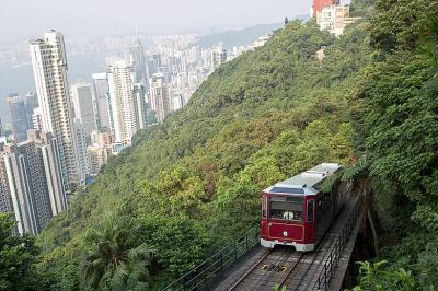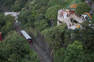 平日(火曜日)の16時ころ、ピークトラムで頂上へ。ピークトラムは意外と待ち時間なく2本目で乗れた。