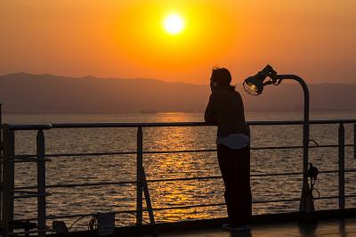 翌朝の朝風呂、露天風呂で有明海からの日の出が見られました。もう、サイコーの風呂でした。