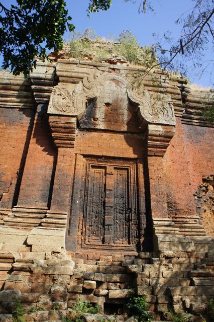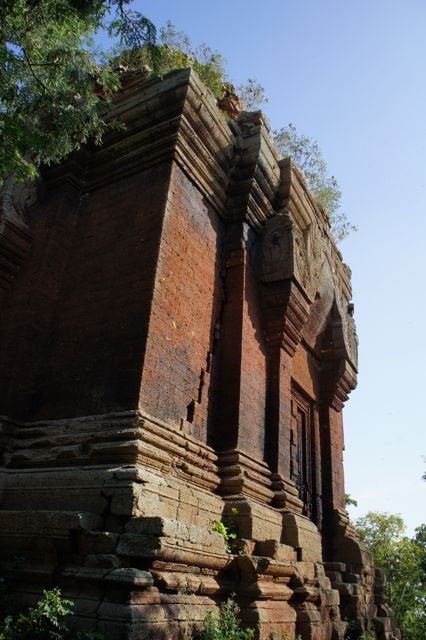 プノンチソーからプレイ・カバッの町まで30分、そこから更に泥道を行くこと20~30分(乾期の場合)。小高い山の上で遺跡の丈夫の茶色い部分がぽつんと見えるのが目印です。