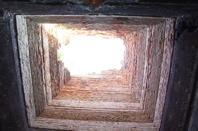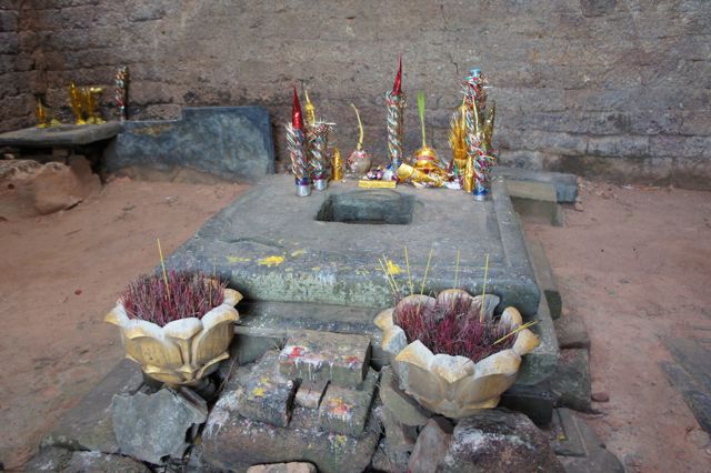麓から階段を登ると、祠堂がいくつか残って、中にヨニがあったり、最近祀られたと思われる仏像があったりします。ラテライト素材なのでオレンジ色が綺麗で、岡の上から見渡すタケオの景色も良いです。