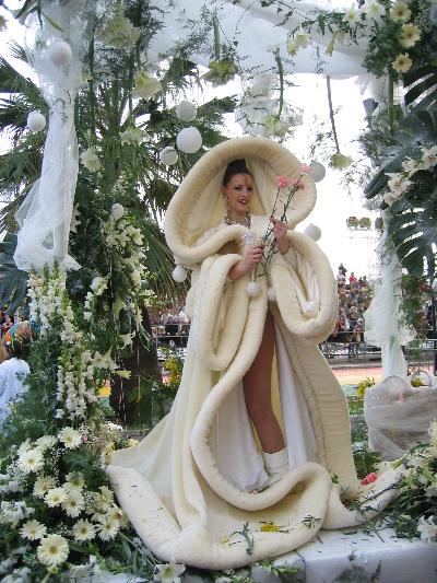 花車に乗ってるお姉さんは、とってもきれいな人ばっかり。お花を投げてくれ...