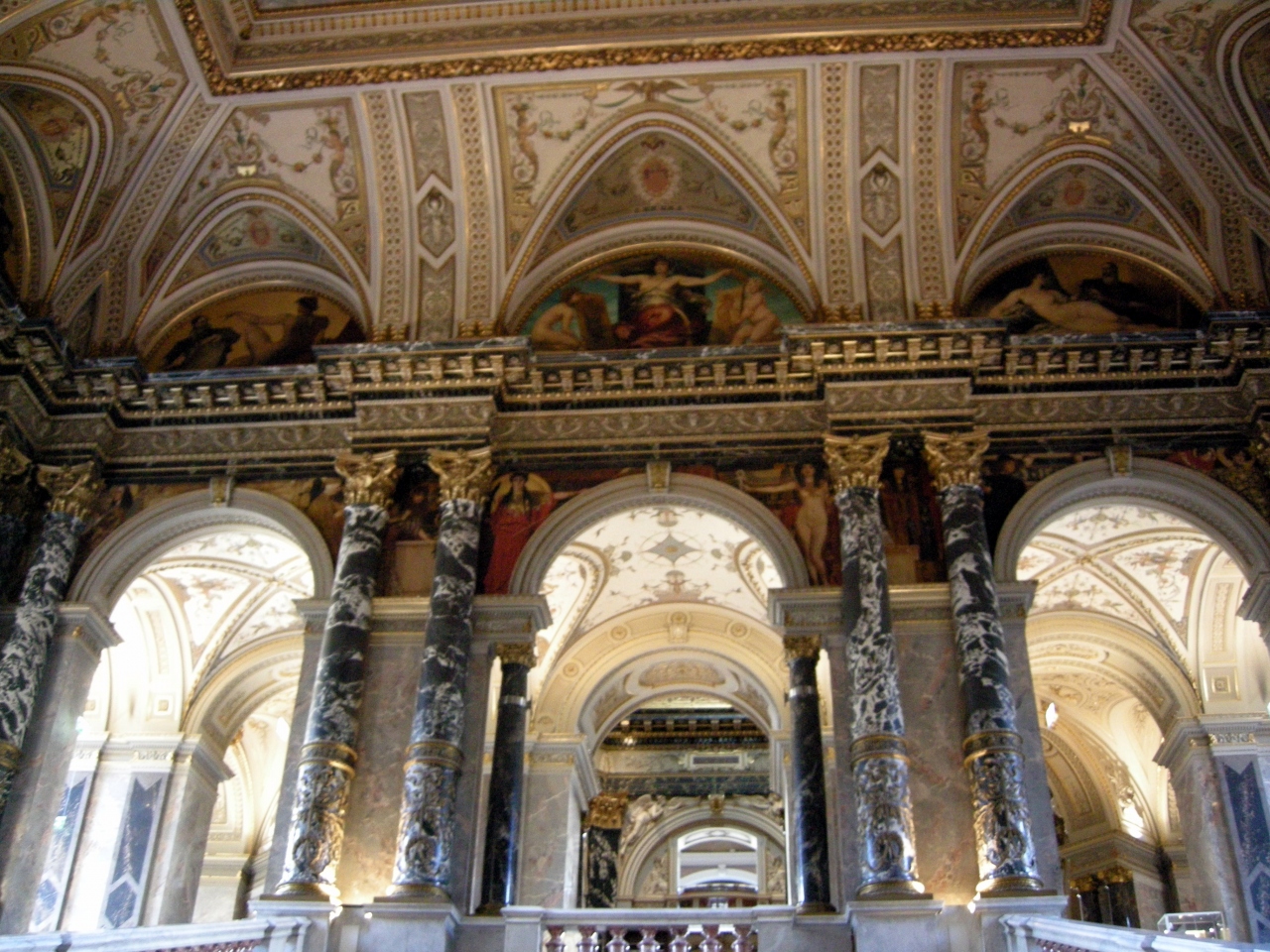 入り口の扉の装飾や、広いエントランスホールのピカピカの大理石やドーム天井、大階段を彩る壁画や天井画などなど、度肝を抜かれる。
