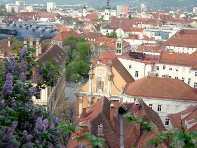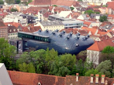 シュロスベルクから見下ろす、古い街並みの屋根の間に見えるクンストハウスも面白い風景
