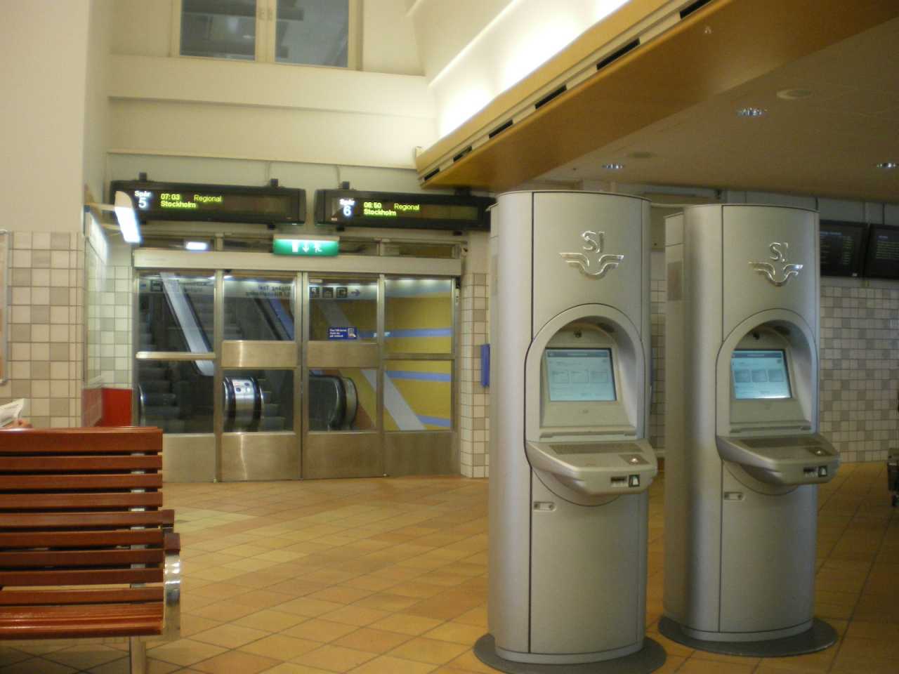 ストックホルムから20分ほどの土地へ移動するため、電車を利用。ストックホルム中央駅に行くと、とても分厚い、時刻表が無料でおいてあるので、それで時刻を確認し、チケットを買購入。窓口で購入したキップとは、時刻が違っていた。不思議。帰りは、朝が早かったので、キオスクが開いていなかったため、自動券売機で購入。これはカードしか使えません。良く確認して画面を薦めていけば、OKでした。