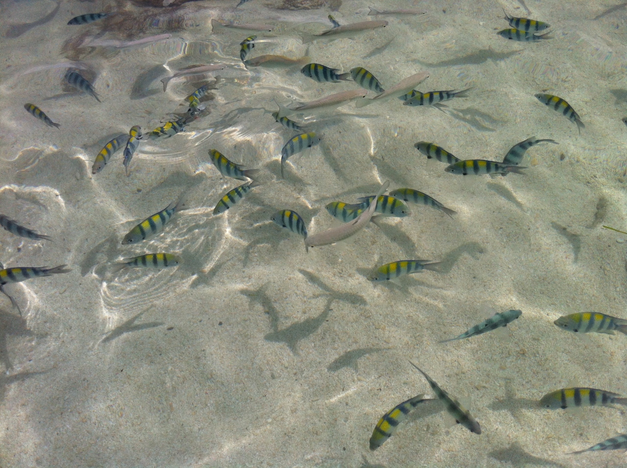 海にパンを持っていくと、すごい数の魚がよってきます。子供も捕まえようと追いかけ回してました。(捕まらなかったですが…)
