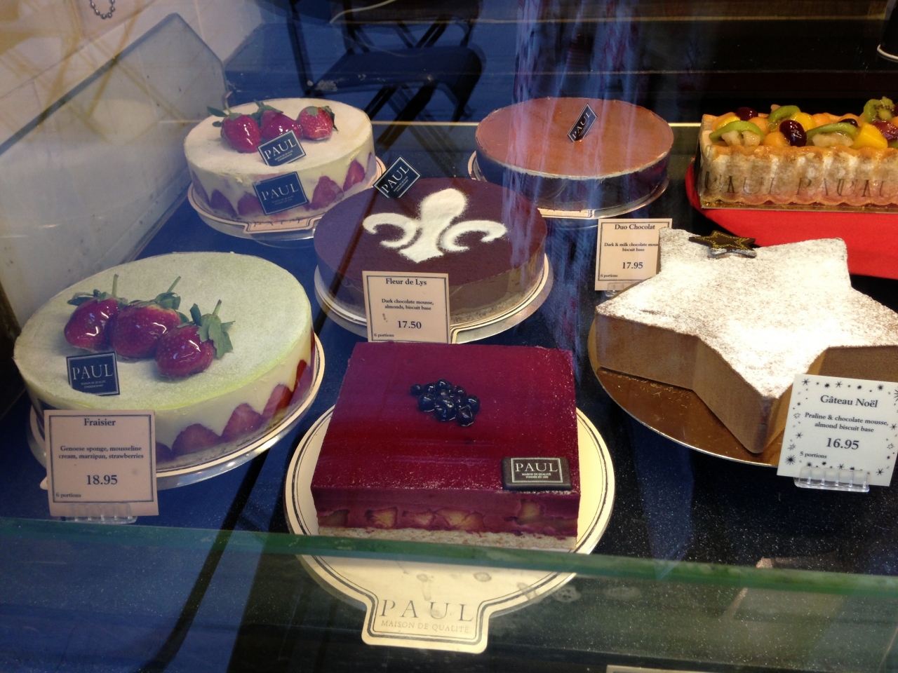 サウスケンジントン駅すぐのところの店舗です。V&A博物館の後、地下鉄の駅に向かっていたらありました。ちょっと休憩するのにちょうどよかったです。バケットなどが美味しいのは言うまでもないですが、ウインドウにあったホールケーキがとってもキレイで魅力的でした。もちろん見ただけなので味はわかりませんが…