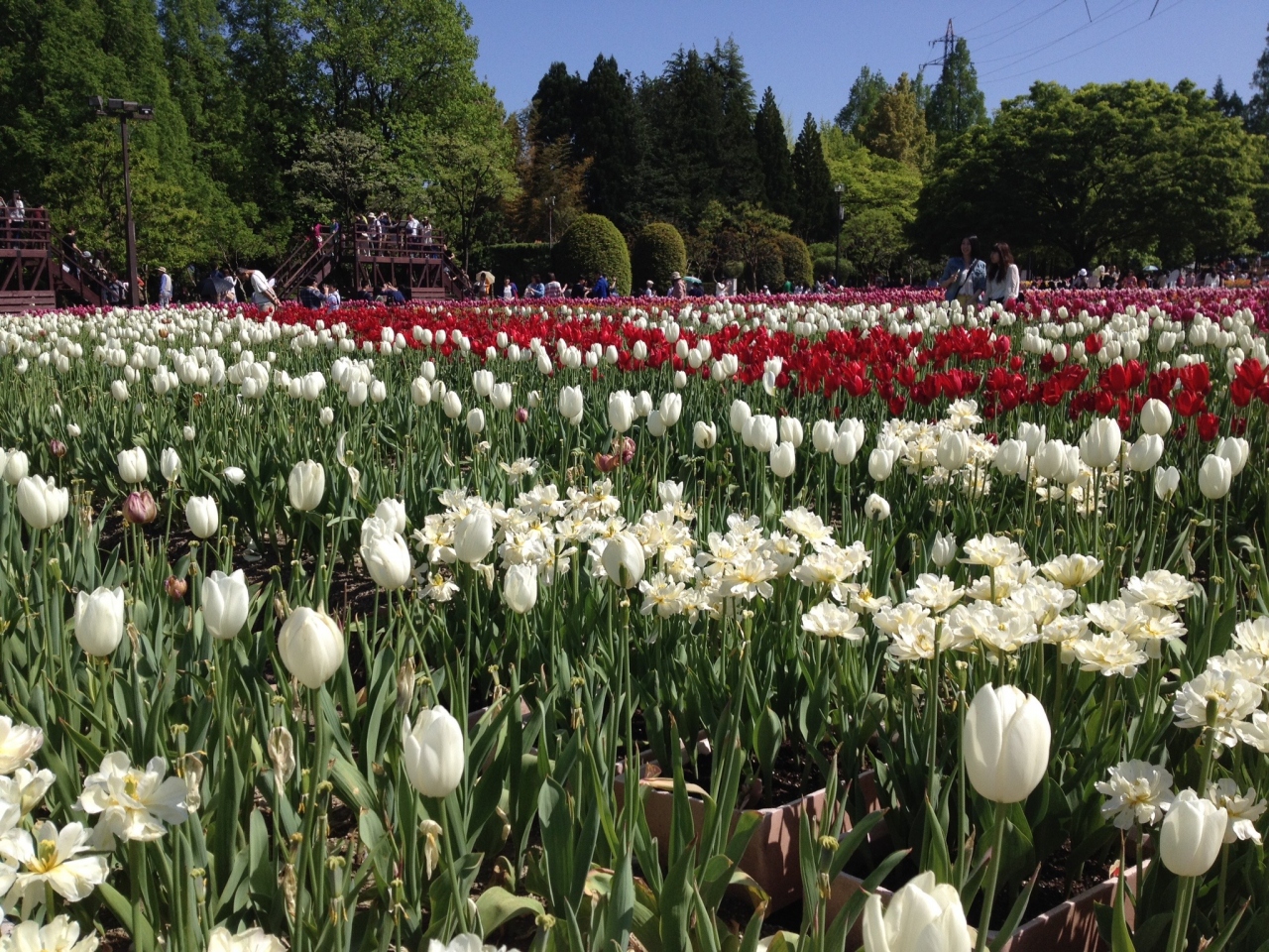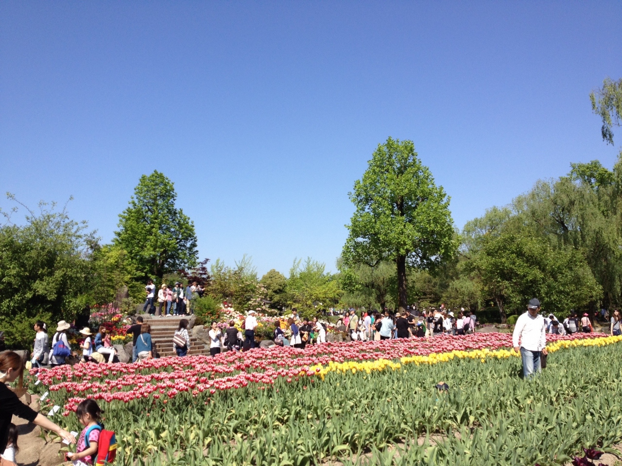 富山市内に向かう途中、「となみチューリップフェア」が開催されていることを知りました。そういえば、普段じっくりチューリップを見る機会はないなと思い、直行。GW真っ最中だったこともあり、かなりの混雑。臨時駐車場から現地へ少し歩きました。