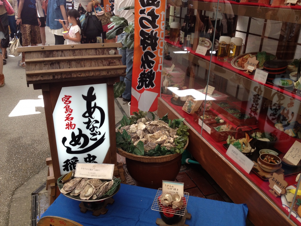 宮島口からフェリーで宮島まで渡り、しばらく観光客の波に乗って歩くと商店街に入ります。ここを大鳥居方面に向かってしばらく進むとお店があります。店頭には弁当や焼きガキも売っており、宮島ならではの風景を造っているお店とも言えるのではないでしょうか。あなごめしは比較的早く出てきます。周りのお客のほとんどが注文していました。