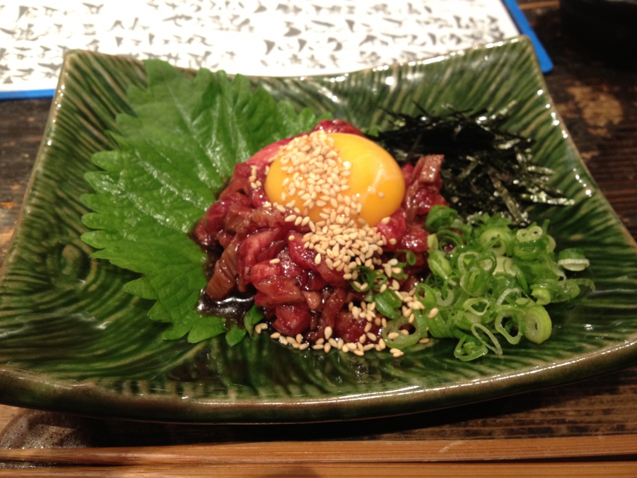 広島に来たらここは外せません。流川繁華街の真ん中にあります。7時開店ですが、直前には何人かの客が店の前で待っていました。その特徴は何と言っても地元広島のお酒がずらりと並んでいること。私は賀茂鶴の吟醸酒を皮切りに5種を試しました。どれもすごくおいしかったですよ。そして食事のほうはというと、これもおいしかったです。特に私は「炙りユッケ」が印象に残りました。炙りとゴマ油の香りが口の中いっぱいに広がり、幸せこの上ないという感じでした。