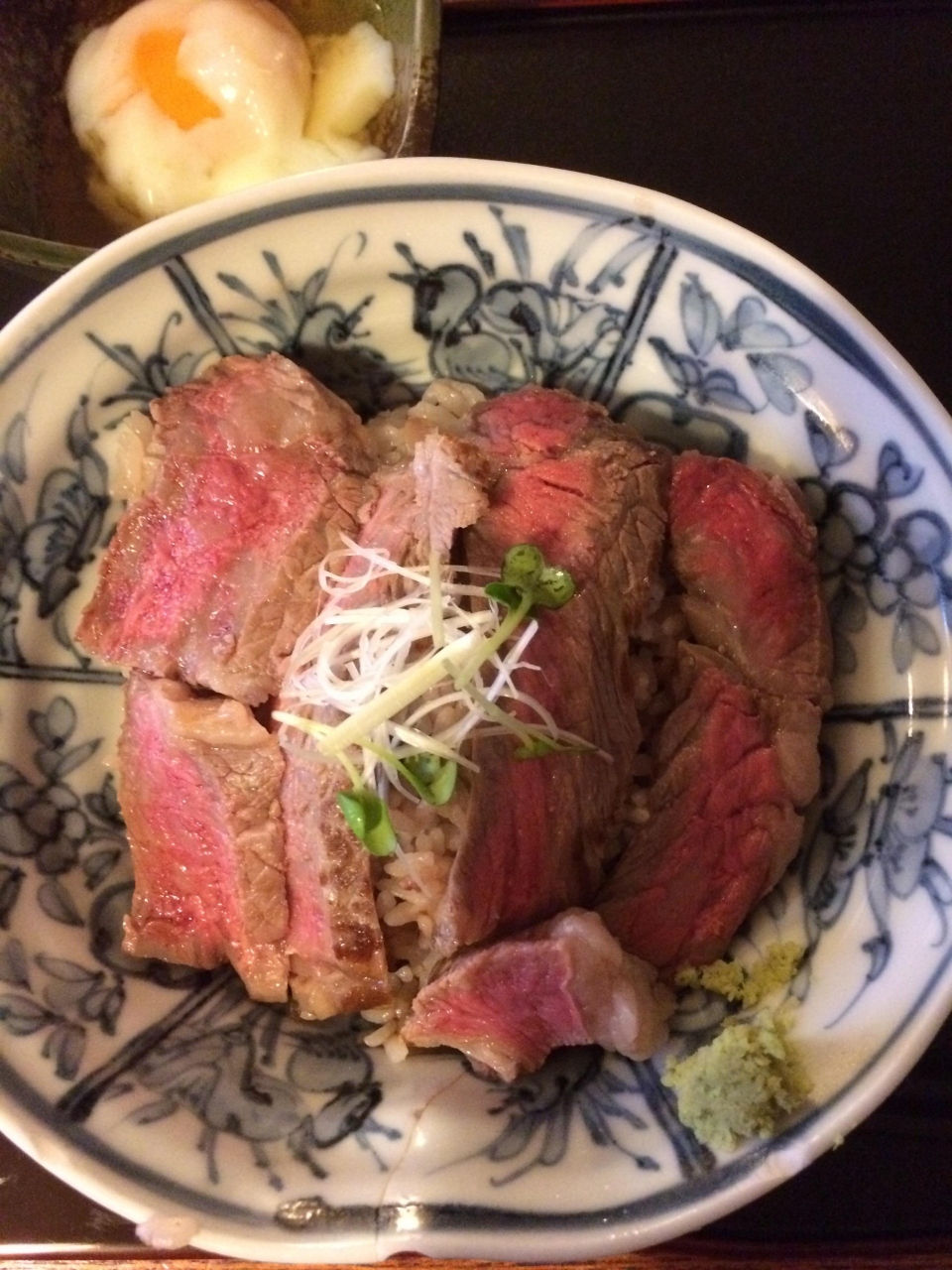 「孤独のグルメ」で興味を持っていて、箱根温泉旅行の際に予約して行ってみた。4人で、足柄牛ステーキの丼と、鮑の丼を二つずつ頼んで半分ずつ頂くことに。ステーキは歯応えありながら柔らかくて、ワサビ、ステーキソース、ポン酢と味を変えながら楽しめる。鮑は肝とバターで炒めてあり、そのソースごとご飯と混ぜて。どちらも絶品!