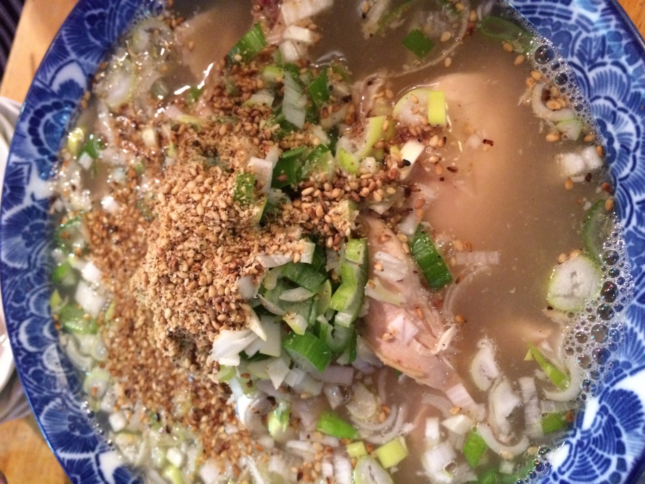 「孤独のグルメ」に登場した韓国料理の店。表のビニールの庇の下のテーブル席に四人で。店内は6、7席のカウンターで、そこにあるお料理を見て注文する。チヂミ、チャプチェ、筍の煮物、肉詰め椎茸など、優しい味の家庭料理が美味しい。締めは予約していた参鶏湯ラーメンを。ビール、ワイン、百日酒×2で1人4000円くらい。
