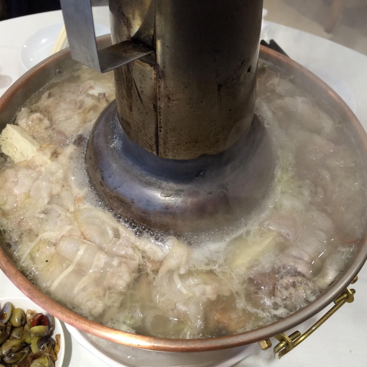 酸っぱい白菜の漬物と豚肉の鍋「酸菜白肉火菜鍋」の有名店。たっぷりの白菜、豚肉、凍豆腐、シイタケ、カニなどが入った煙突鍋が大中小あり、我々は4人で中をオーダー。つけだれコーナーにある調味料を好きなように自分で配合して作る。醤油、お酢、胡麻ペースト、生姜、香油、ニラ、にんにく、唐辛子、パクチーなどなど。ドリンクはビール、ワイン、紹興酒などあり。言葉は通じないけど日本語メニューあり。