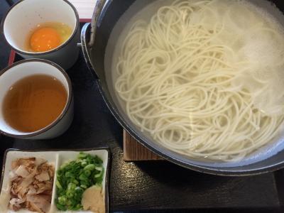 長崎空港一階にあるうどんの店。地獄炊きは、丸くて細い五島うどんの釜揚げで、あごだしにネギと生姜をいれたものと、生卵に醤油とかつお節をいれたもの、2種類のつけだれがあり、熱々でいただく。うどんはつるつる喉越し良く、味も変化をつけられるので、いくらでも食べられる感じ。