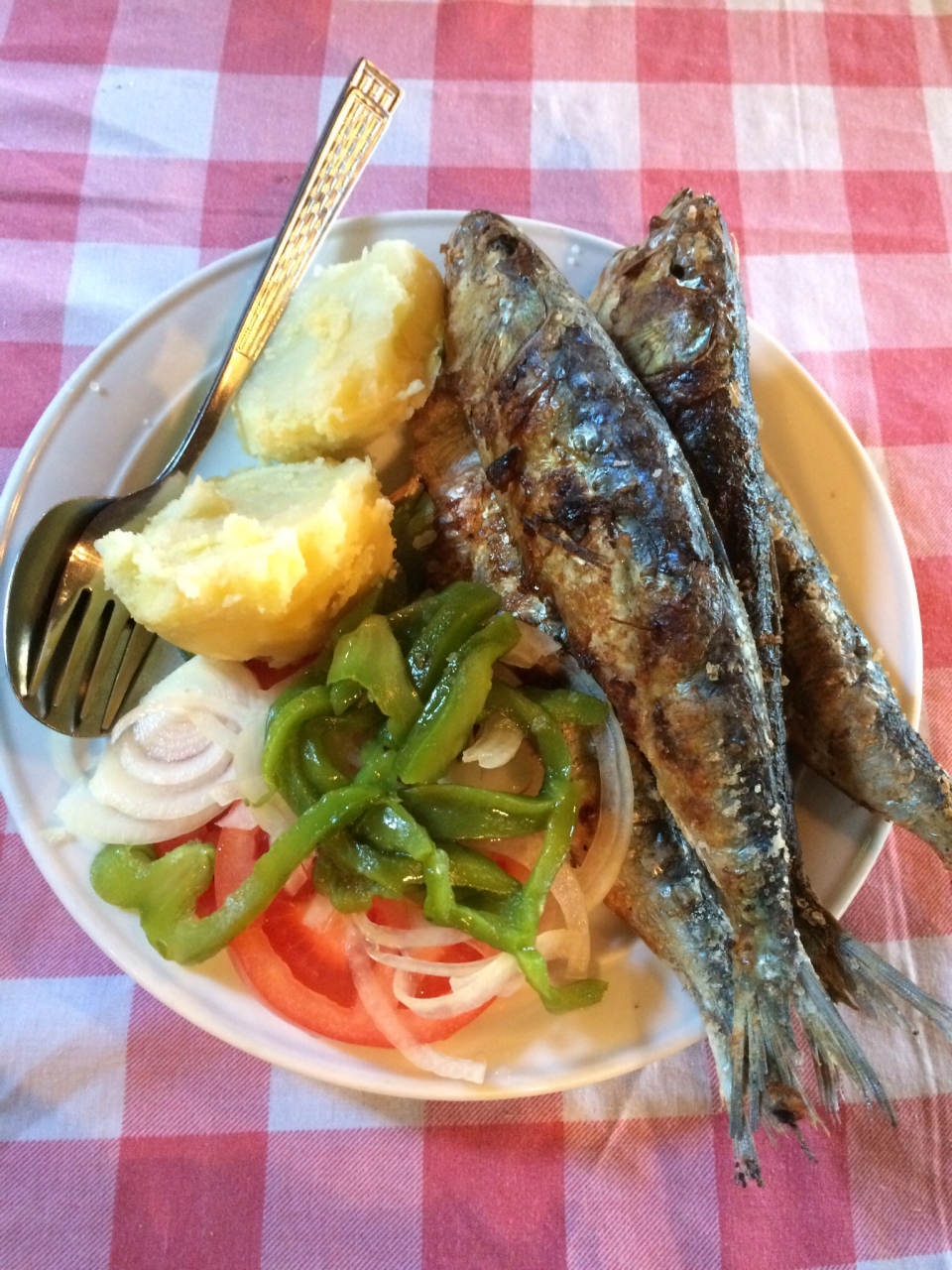 ロードストーズベーカリーの前からタクシーで。11時半過ぎに着いて12時の開店とともに入りました。2人で名物のいわしのグリル、バカリャウのコロッケ、トマトソースのエビの炒め、白ワインをデキャンタ(特大)をオーダー。いずれもとても美味しかった!店の入り口からは想像できない広々とした店内には、バーのある中庭もあり、緑豊富で南国リゾートムードが良いです。
