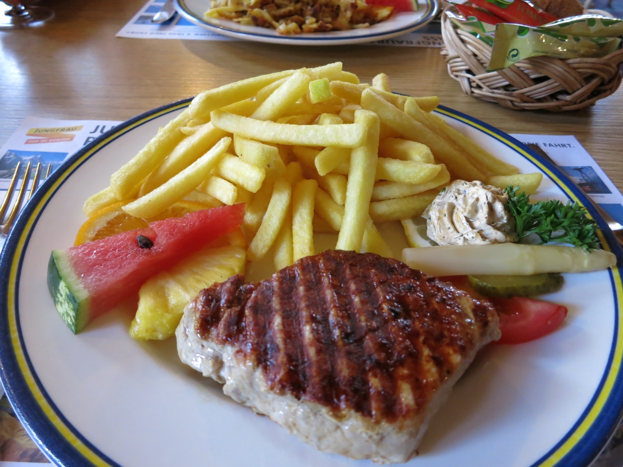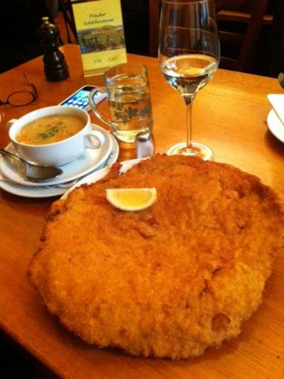 ガイドブックには必ずのってる巨大シュニッツェルが有名なお店。お昼をはずして行ったのですが、なかなかな行列でした。が、せっかくきたので並ぶことに。店内は2階もあり結構広いのですが、通路にも人が並び、お店の人は動きにくそうでした。注文した巨大シュニッツェルは、お皿を大きくはみだした、かなりのサイズ。でも薄いし、カリカリしてさっぱりしてますので、女性でもぺロリと食べきれると思います。