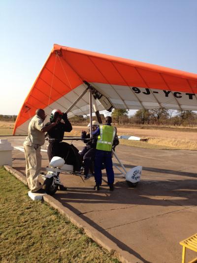 滝の迫力を間近で感じた後は、空からのマイクロライトがおすすめです。防寒のため宇宙服のような着ぐるみをきて飛びます。パイロットはもちろん英語で説明してくれますが、なんとなくわかれば大丈夫。「エレファント!!」とか教えてくれます。