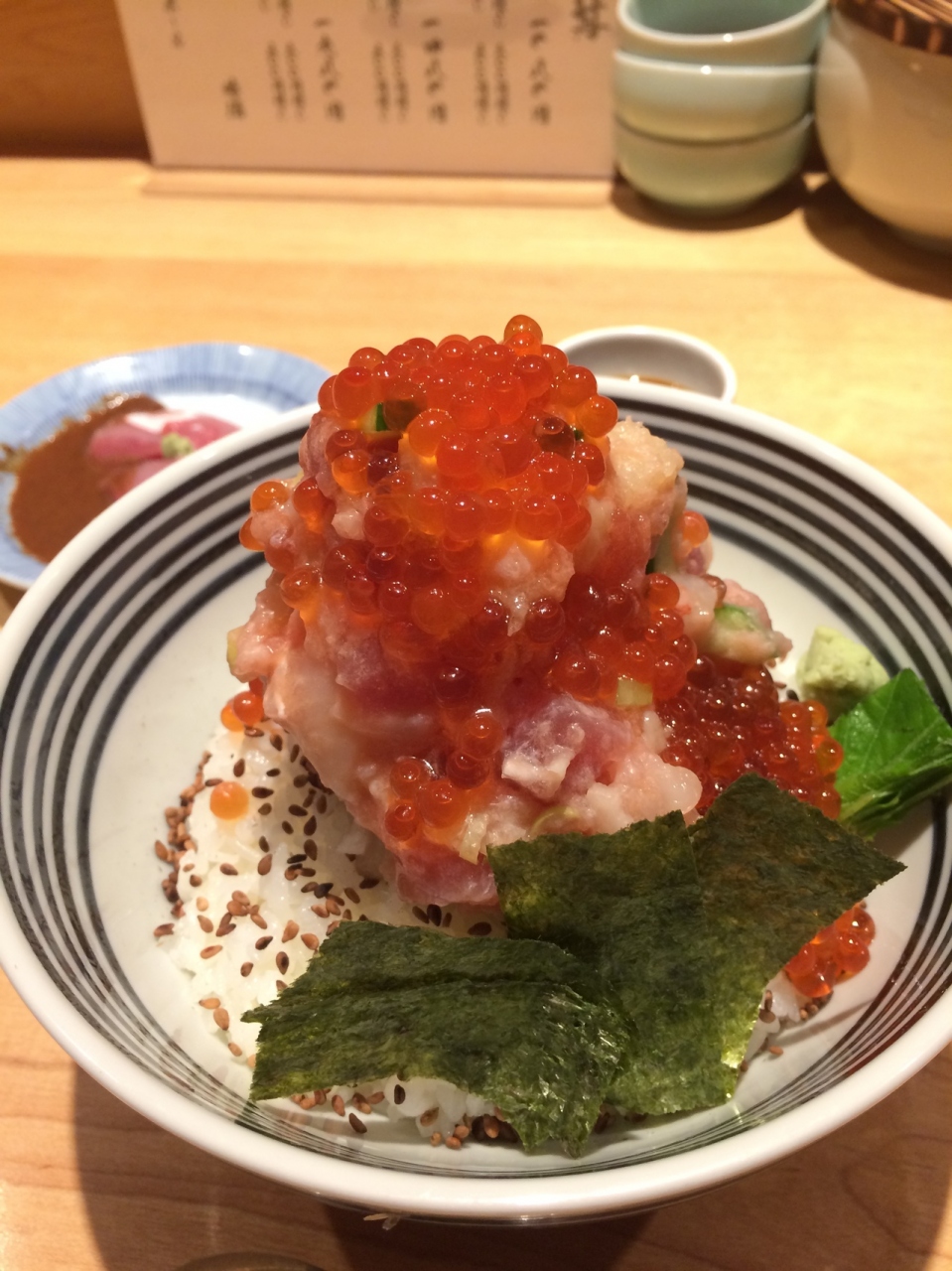 最初入り口がわからず通り過ぎてしまいました。坂の途中、入り口は奥まってるので注意が必要。カウンターのみであまり広くありません。味は本店と変わらず、いくら増しも300円です。本店よりは行列がありませんが、混むことは間違いありません。