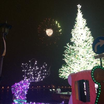 クリスマスツリーの点灯式と花火が楽しめるということで行きました。ツリーはその前から点灯してますが、一回15分前に消灯し、改めて点灯と花火、という流れです。人はそれなりにいますが、花火は直前でも十分楽しめます。