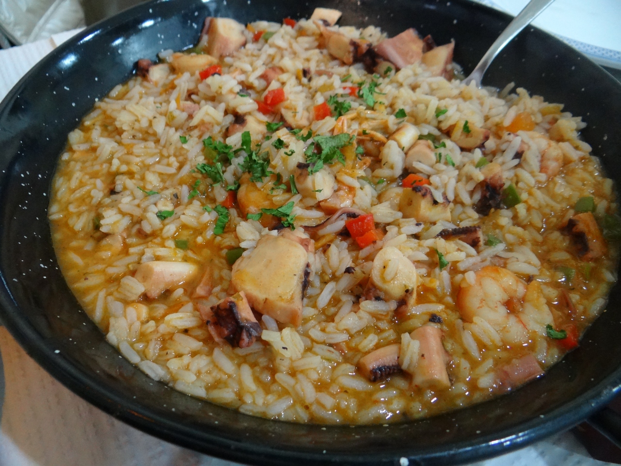 本日のおすすめだという「タラ」、「タコと海老のリゾット」、「イワシの塩焼き」を注文。イワシは思ったよりも大きく食べごたえあり。リゾットに入っているタコはとても柔らかくどれも優しい味するの家庭料理といった感じでした。ワインと食後のコーヒーを付けても3人で50ユーロ未満の良心的なお値段で大満足。おススメです!- 旅行時期