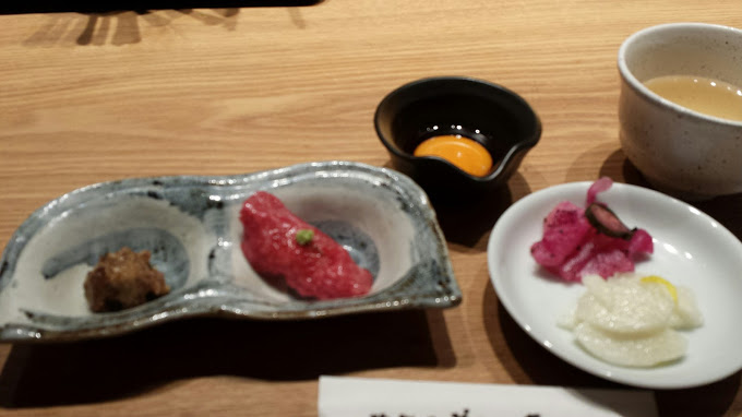 平日のランチに利用しましたが、店内はカウンター席が10席なので、少々待ちました。和牛重専門店でメニューは松・竹・梅。楽しみに来訪したので奮発して松を頂きました。目の前で肉焼いてます。肉のしぐれ煮がまた美味で後半はひつまぶしのように楽しめます。突き出しのたたきの握りも美味しかったです。