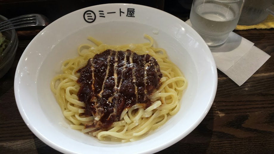 事前にチェックし行ってみました。商店街を割と歩いて見つけました。運よく並ばなくても入れました。8席程のカウンターのみなので、タイミングですね。食券を購入すると席を案内され丁寧に荷物は足元にフックがありますと説明してくれました。茹でたてを素早く提供してくれます。ラーメン鉢みたいな器にもちもちの麺、そしてソースはデミグラスソースのようなソースです。ミートソースはトマト味ではなかったです。