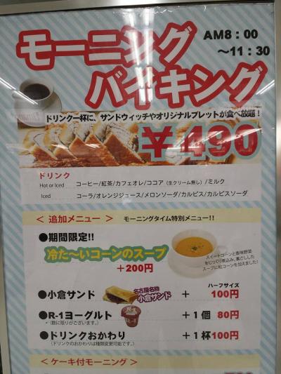 ホテルから駅に向かう途中でバイキングのパネルを見て入りました。白が基調で明るい店内。パンと卵は食べ放題。サンドイッチは食べやすい大きさでパンも程良いサイズにカットされています。やっぱり小倉サンドは食べとかなきゃ。別料金100円プラスで注文しました。作りたてを持ってきてくれます。さらっとした餡で美味しかったです。