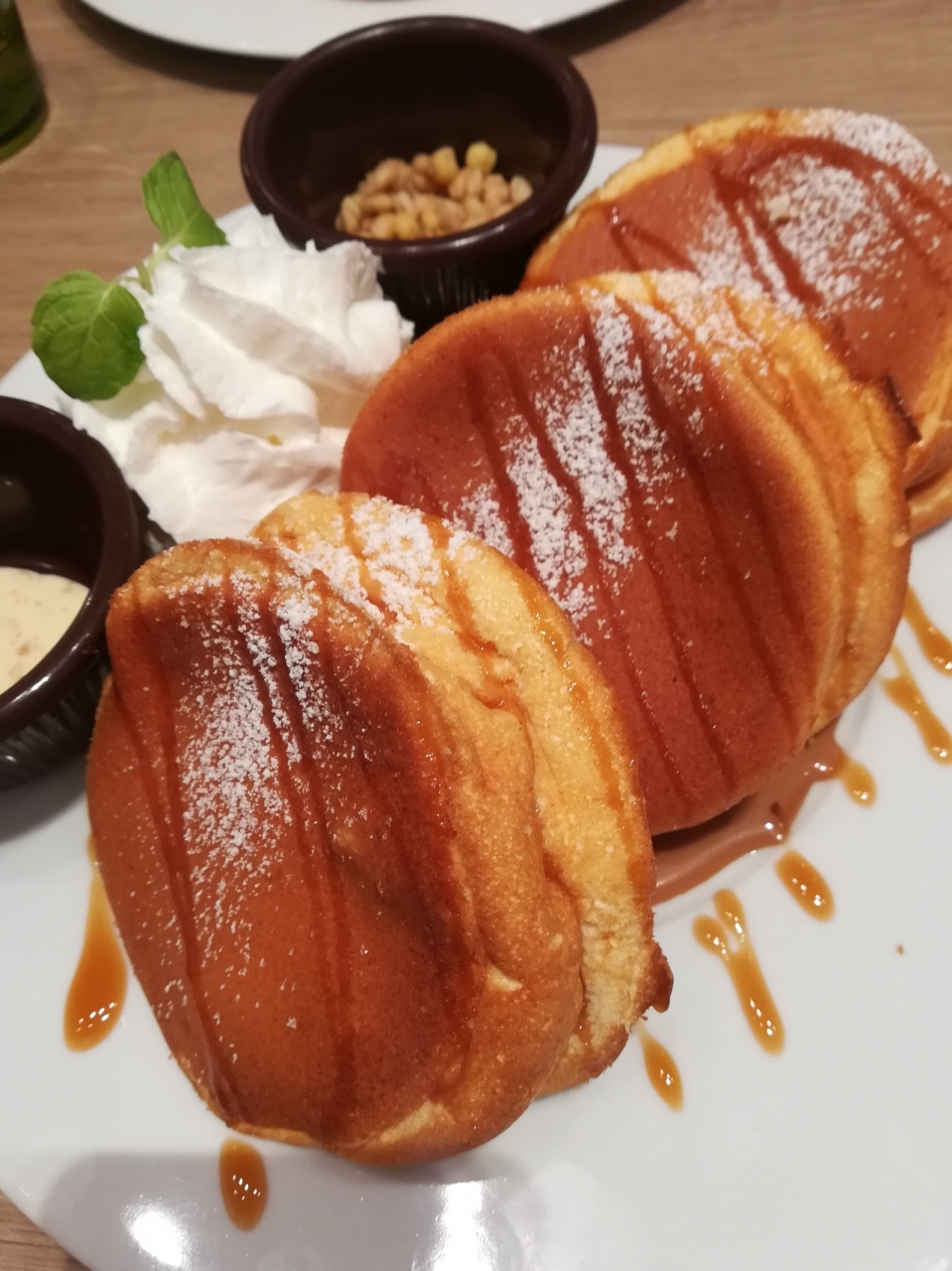 ミルクティーパンケーキ1,490円とチーズパンケーキ1,080円を頼み二人でシェアしました。パンケーキは厚みがありふわふわでおいしいです。でもミルクティーのソースがかなり少なかったです。また、チーズパンケーキは実はプレーンだったことにメニューからはわかりませんでした。プレーンだけチーズパンケーキと記載があり他のパンケーキには記載がなかったのですが、すべてチーズパンケーキのようでした(チーズパンケーキはおいしいので良いのですが、プレーンとしっていたら他の味を頼んだかも)。ネットでみたアボカドサーモンパンケーキみたいのを頼みたかったのですがしょっぱい系のパンケーキはメニューに見当たりませんでした。- 旅行時期
