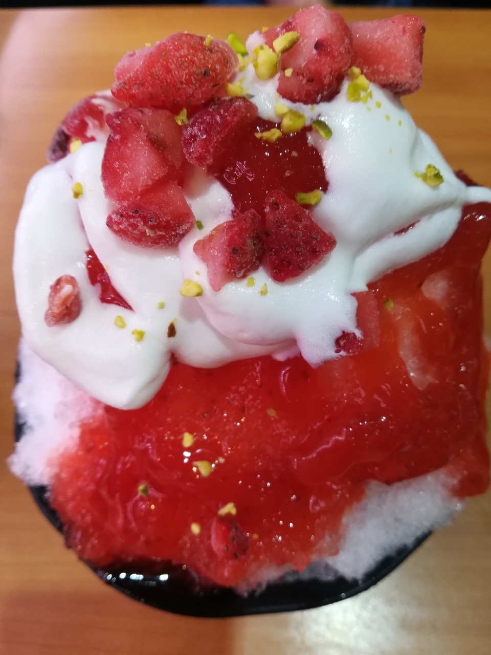デザートにイチゴかき氷を食べました。安いからと思っていたらすごく大きくてシロップもイチゴもすごくてびっくり!おいしかったです!- 旅行時期