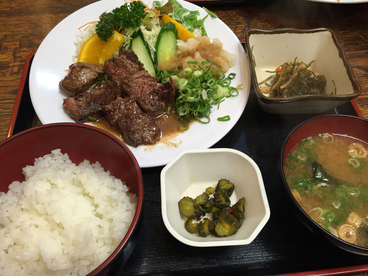 海鮮丼や揚げ物系も豊富な中、栄養つけようということで、母と二人でサイコロステーキ定食710円をオーダー。